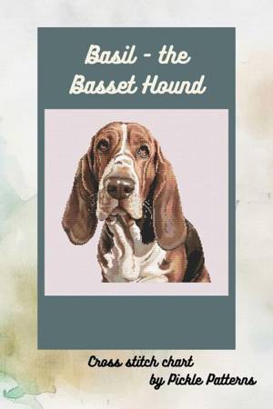 The cross stitch chart is a portrait of a Basset Hound with white, tan and black markings. The image is of the head and shoulders of the dog concentra...Savoir plus