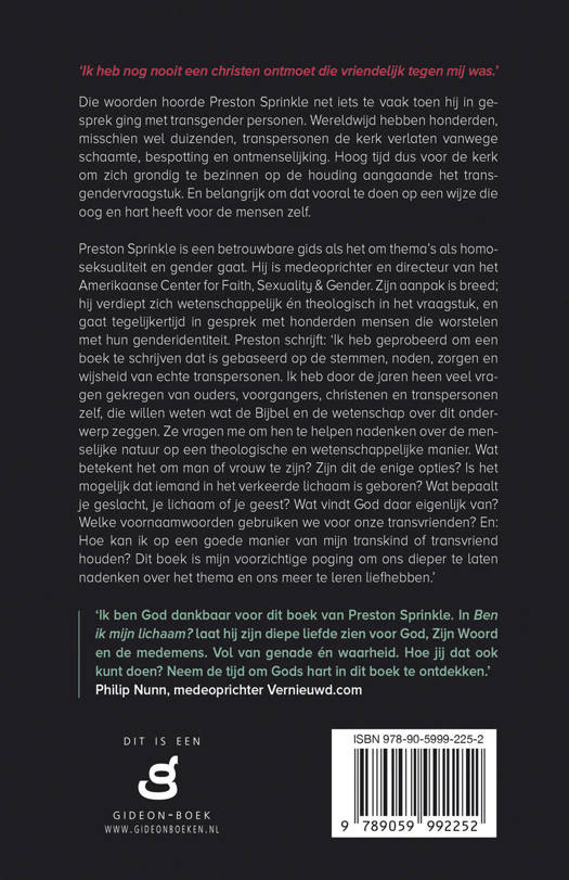 Preston Sprinkle is een betrouwbare gids als het om thema’s als homoseksualiteit en gender gaat. Hij is medeoprichter en directeur van het Amerikaanse Center for Faith, Sexuality & Gender. Zijn aanpak is breed; hij verdiept zich wetenschappelijk en theologisch in het vraagstuk, en gaat tegelijkertijd in gesprek met honderden mensen die worstelen met hun genderidentiteit. Preston schrijft: ‘ik heb geprobeerd om een boek te schrijven dat is gebaseerd op de stemmen, noden, zorgen, en wijsheid van echte transpersonen. Ik heb door de jaren heen veel vragen gekregen van ouders, voorgangers, christenen en transpersonen zelf, die willen weten wat de Bijbel en de wetenschap over dit onderwerp zeggen. Ze vragen me om hen te helpen nadenken over de menselijke natuur op een theologische en wetenschappelijke manier. Wat betekent het om man of vrouw te zijn? Zijn dit de enige opties? Is het mogelijk dat iemand in het verkeerde lichaam is geboren? Wat bepaalt je geslacht, je lichaam of je geest? Wat vindt God daar eigenlijk van? Hoe kan ik op een goede manier van mijn transvriend houden? Dit boek is mijn voorzichtige poging om ons dieper te laten nadenken over het thema en ons meer te leren liefhebben.’